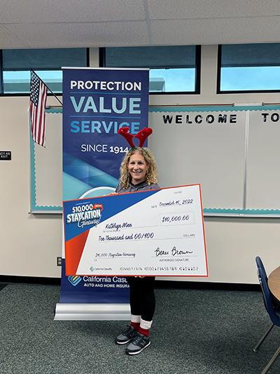 San Mateo, CA, December 19, 2022—Kathryn Winn, a California Teachers Association (CTA) member and elementary school teacher at Morningside Elementary in Garden Grove, California, has won California Casualty’s 2022 $10,000 Educator Staycation Giveaway. Winn was one of over 23,000 eligible K-12 public school employees to enter the national contest.