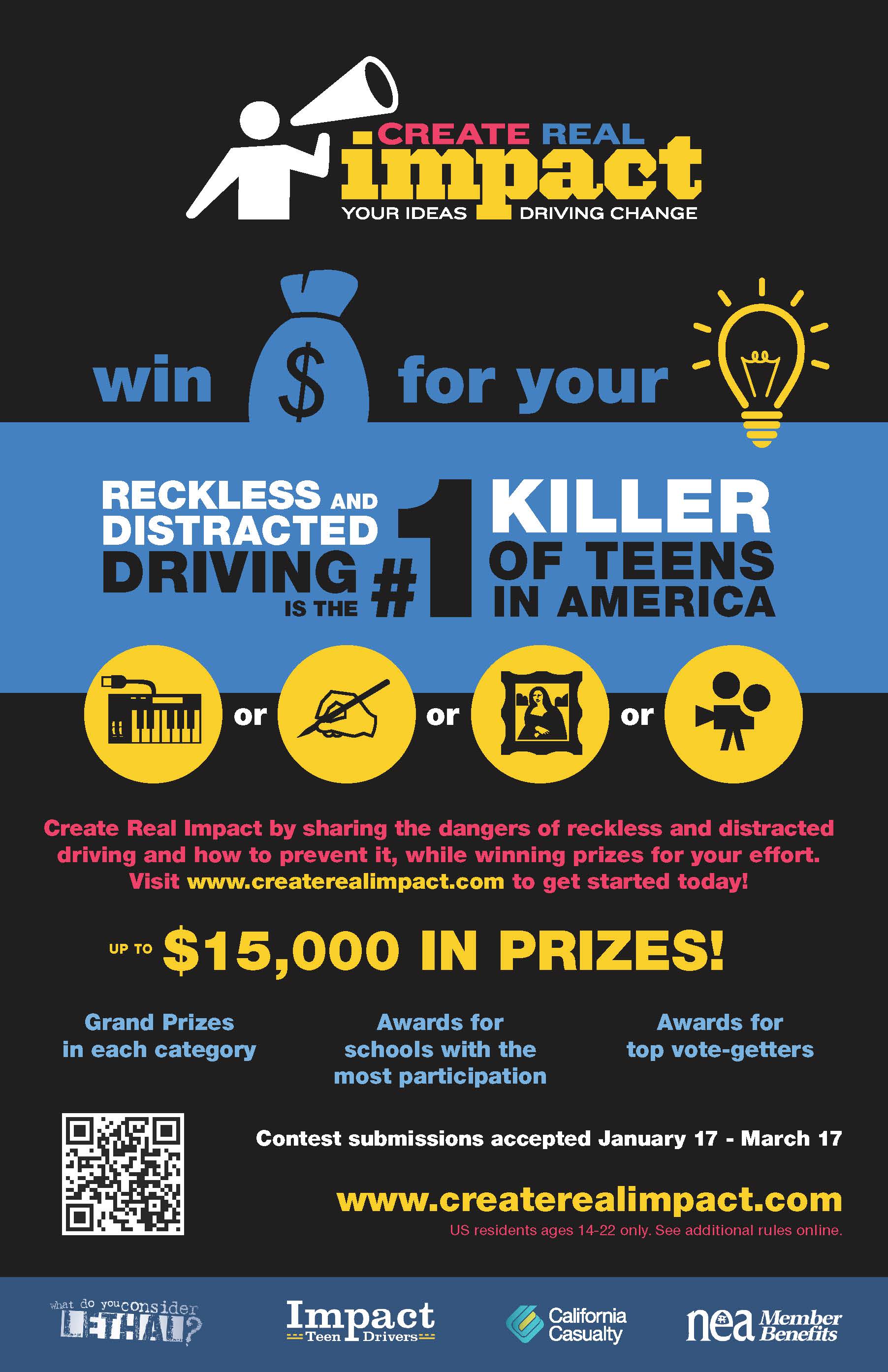 The Create Real Impact contest was initiated in 2009 as a proactive solution to the deadly epidemic of inattentive teen driving. An increase in highway fatalities in both 2015 and 2016 illustrates the need for the contest. The National Highway Traffic Safety Administration finds that the largest proportion of drivers involved in deadly distracted driving crashes continues to be teens.