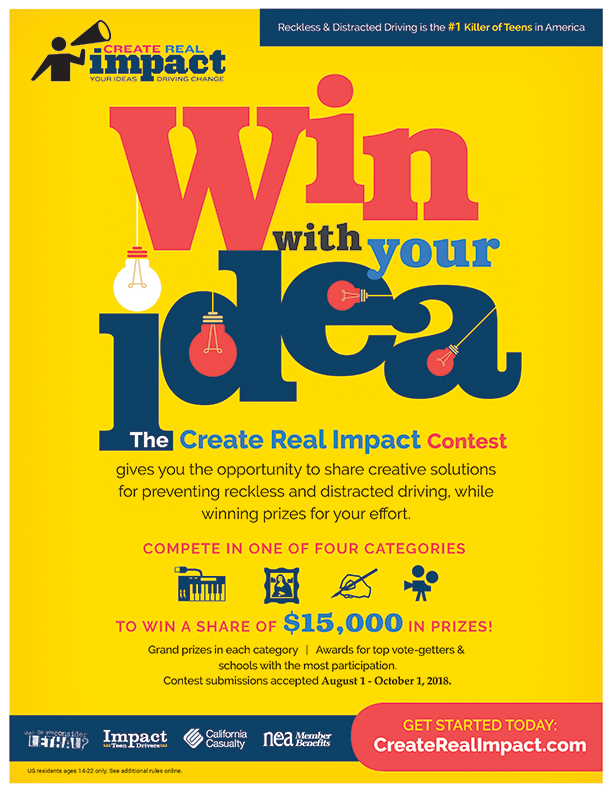 San Mateo, CA, August 1, 2018 – Students can win $500 to $1,500 in the Impact Teen Drivers and California Casualty 2018 Fall Create Real Impact contest. Entries of empowering creative approaches to stop distracted driving are being taken now through October 1 at www.createrealimpact.com.