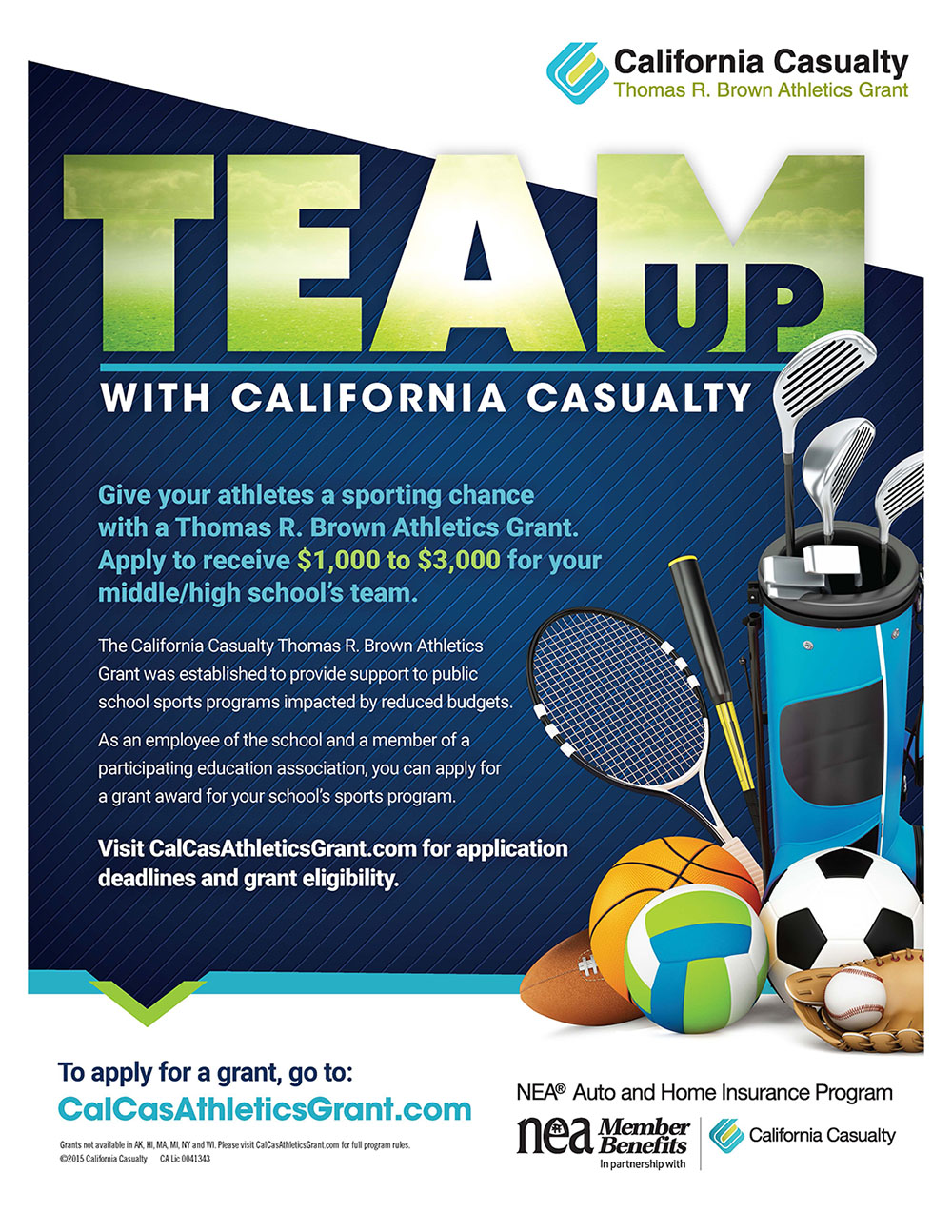 California Casualty has served educators since 1951 and has provided the NEA® Auto and Home Insurance Program since 2000. The company has other initiatives that give back to educators for all their hard work including the $7,500 School Lounge Makeover®, www.NewSchoolLounge.com/NEA; $500 California Casualty Award for Teaching Excellence, in conjunction with the NEA Foundation, www.neafoundation.org/for-educators/awards-for-teaching-excellence; $250 Music and Arts Grants, www.calcasmusicartsgrant.com; and $200 Help Your Classroom grants, www.calcas.com/help-your-classroom.