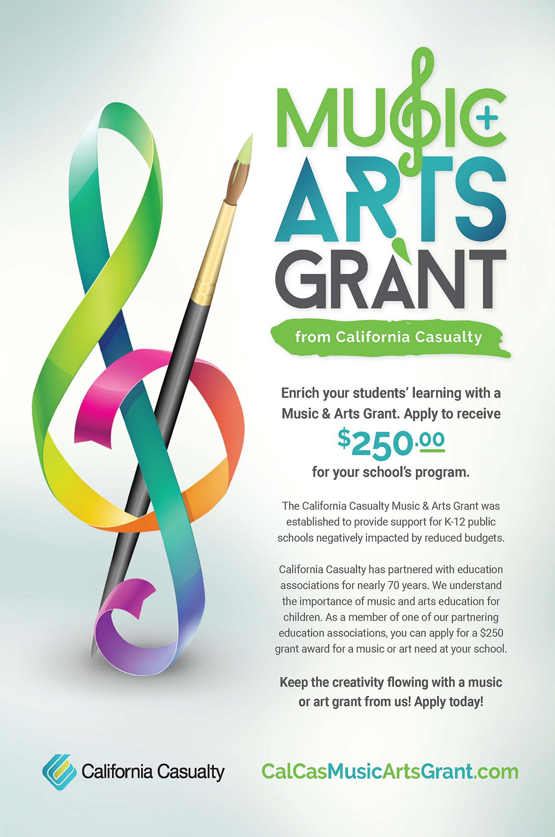 Apply now for the California Casualty Music and Arts Grant, and the chance to receive $250 for a worthy music, art or performance project, at www.calcasmusicartsgrant.com.
