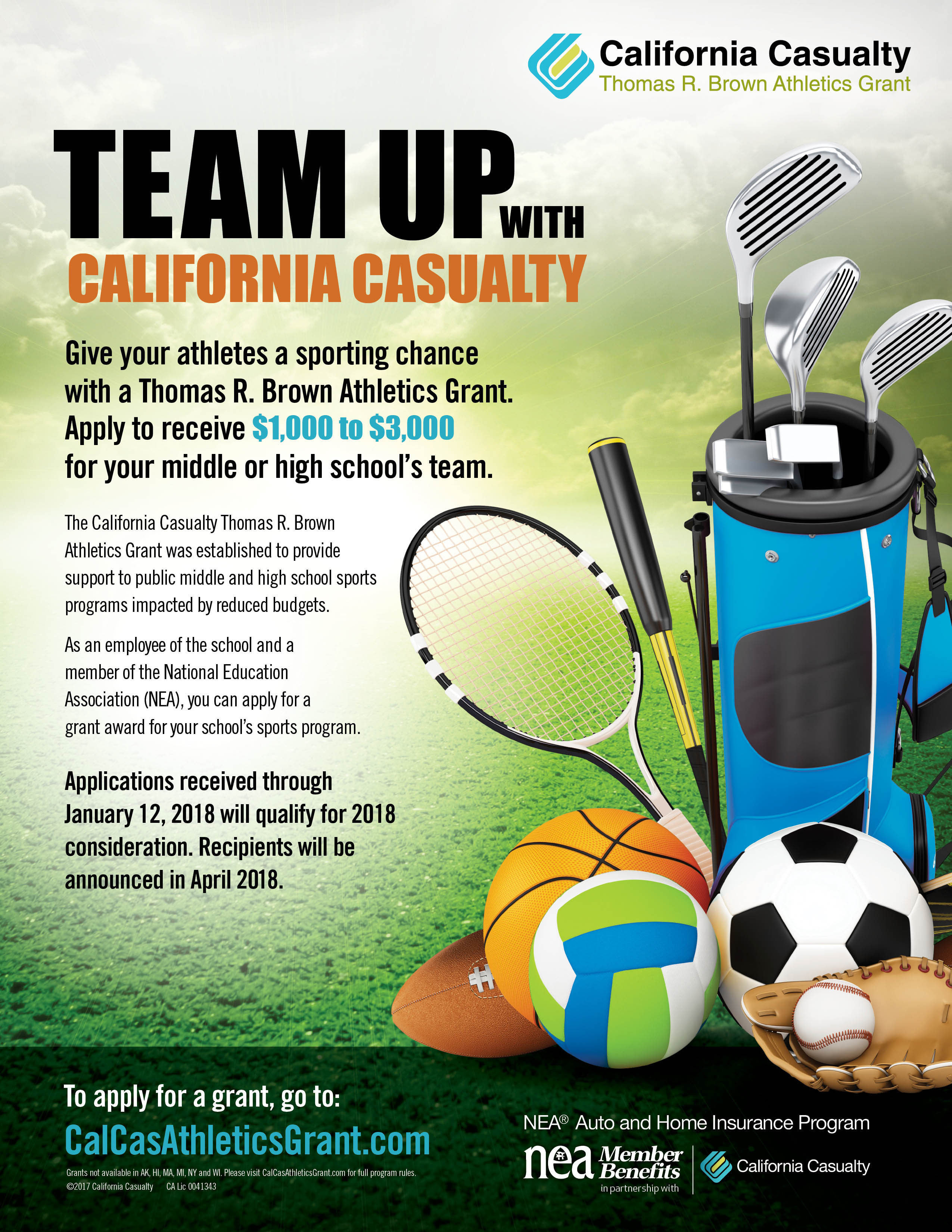 San Mateo, CA, October 2, 2017 – The race for a 2018 Thomas R. Brown Athletics Grant from California Casualty is now on. Public high schools and middle schools in need of financial help for their sports programs are urged to apply at www.calcasathleticsgrant.com. Applications must be received by January 15, 2018 for consideration for the 2017/2018 academic year. Qualifying teams can score up to $3,000.