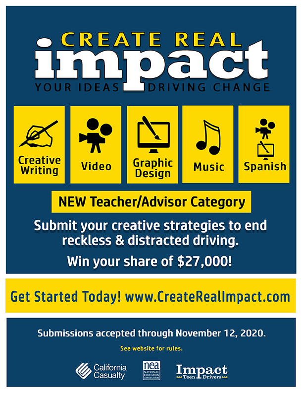 San Mateo, CA, August 25, 2020— Impact Teen Drivers Fall Create Real Impact Contest (CRI) once again invites students to get creative and speak out about the #1 killer of young people - reckless and distracted driving.