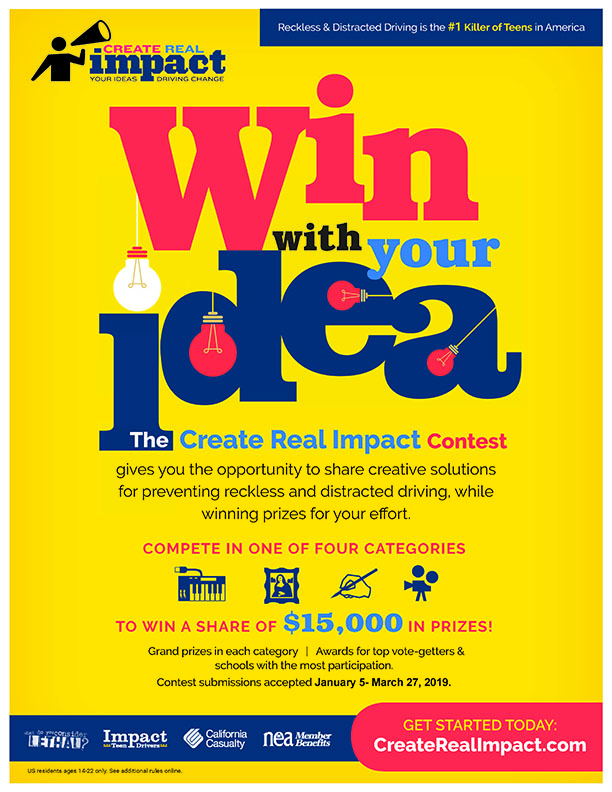 The 2019 Fall Create Real Impact contest will kickoff in August. Entries will be taken at www.createrealimpact.com. For more information on how to get schools and students involved, please contact info@impactteendrivers.org.