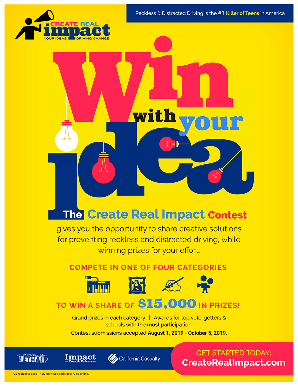 The Create Real Impact Contest challenges students ages 14-22 to make a difference in the battle to stop unnecessary crashes, the number one killer of teens in the United States. They can submit creative works showcasing solutions to reckless and distracted driving at www.createrealimpact.com. The entry deadline is October 5, 2019.