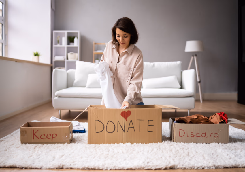 Use the Four-Box Method: Label boxes or bins as Trash, Give Away, Keep, and Relocate. Sort items accordingly.